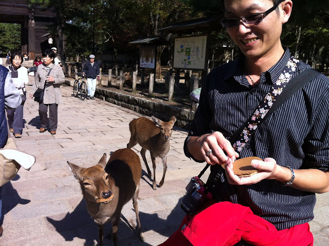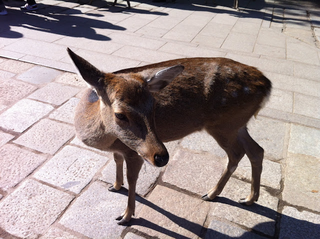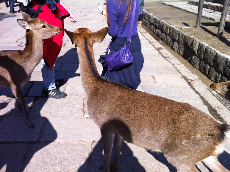 我的體會是,東大寺周邊的鹿在搶食鹿餅上比較積極,行動上也比較暴力,而奈良驛出來之後遇到的鹿比較溫和一點,如果你拿著鹿餅逗牠逗太久,牠就乾脆轉頭放棄不理你了。
