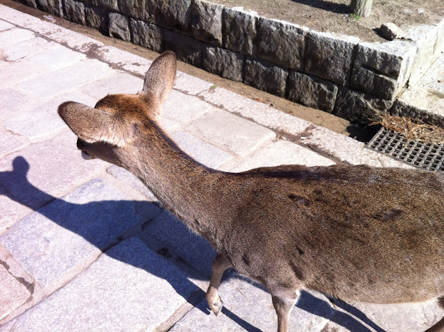 出了奈良驛走沒多久就遇到了在路邊悠閒的曬著太陽或散步的鹿。於是忍不住就買了鹿餅開始沿路餵食了。