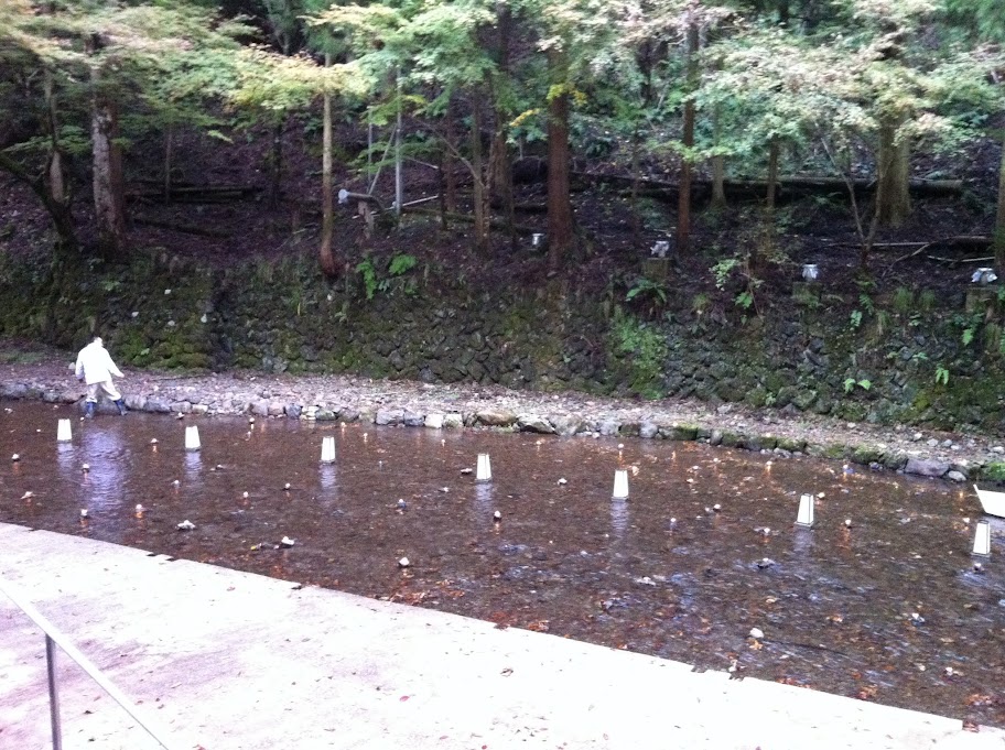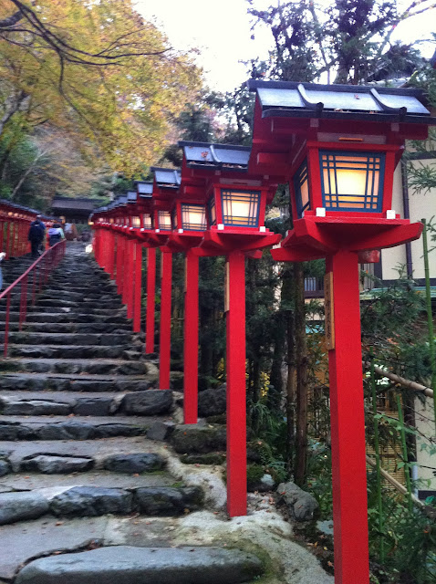 剛好遇上貴船的花燈路。工作人員在低溫下穿梭在河床上放置入夜後會點亮的花燈。