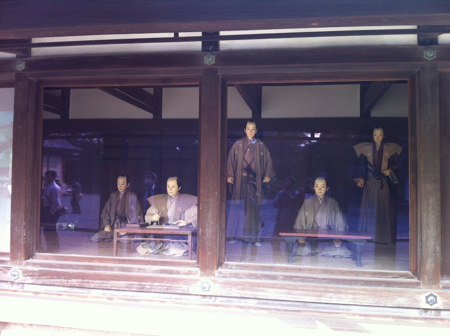 因為手機相機很爛,室內又光線不足,所以在二之丸御殿內我完全沒有拍照,不過裡面的確是非常的大。各個歷史場景都有類似前面警備所那樣的人偶重現歷史事件,例如:德川慶喜大政奉還、招待各地來的大名等等。