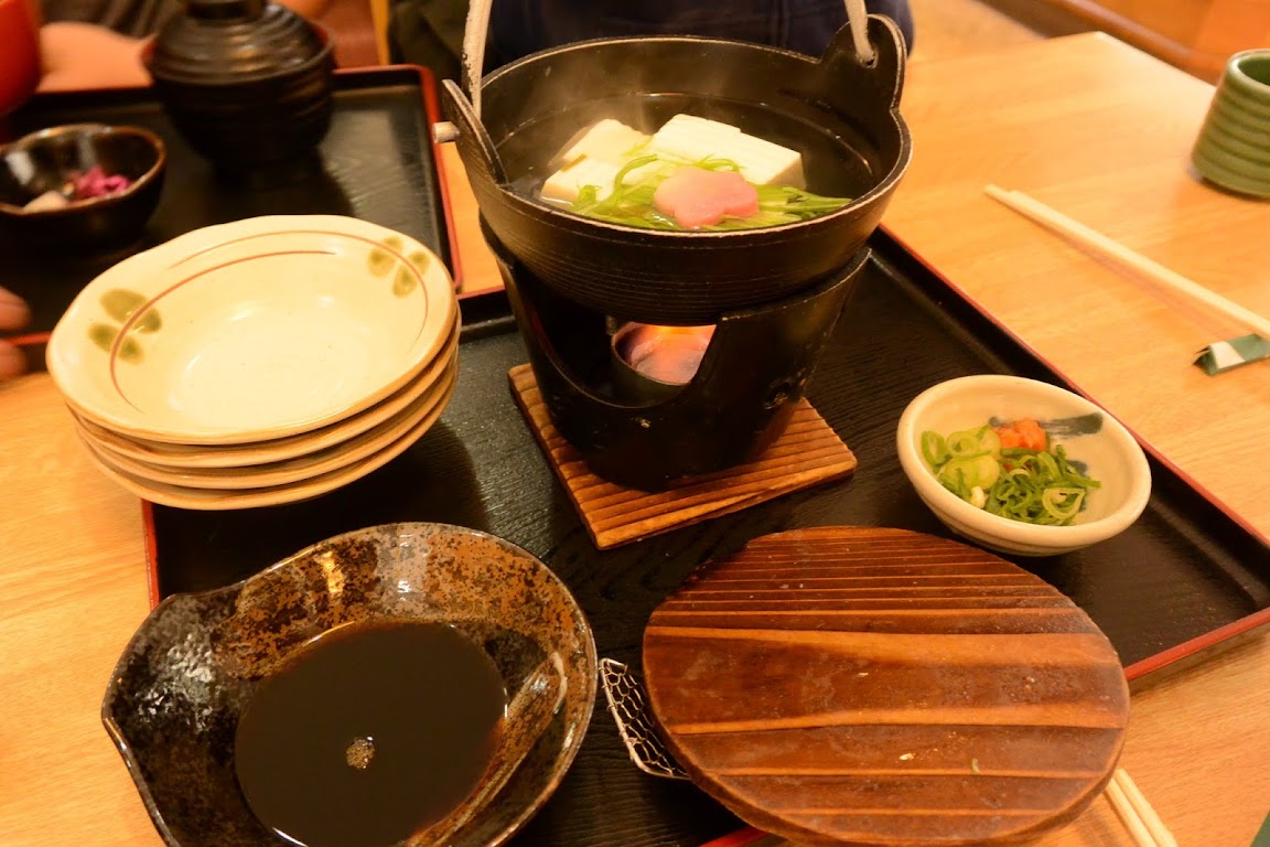 搭上電車就一路往嵐山出發了,中途也不用換車,終點站就是嵐山也不怕坐過站。大概半個多小時吧,我也忘了搭了多久時間,總之就是順利抵達嵐山。此時已經是下午將近一點,肚子當然是餓到不行,因為此次同行的朋友有兩位是第一次來京都,於是就帶他們來一嚐京都的湯豆腐料理。